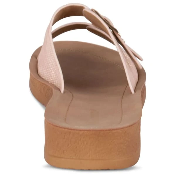 - Slip on sandal with double buckle shimmer detail.